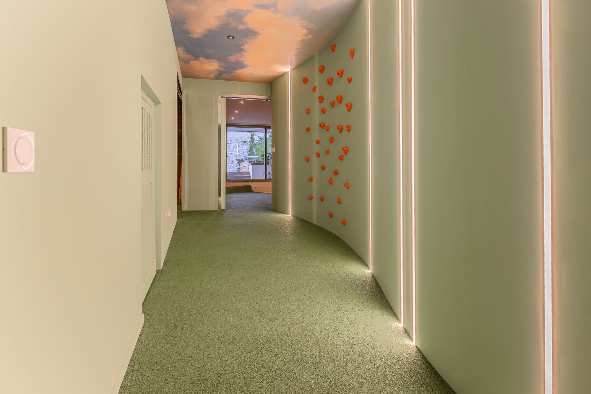 Le rez-de-chaussée, largement ouvert sur le jardin, propose aujourd’hui un espace pensé pour les enfants (sol amortissant, mur d’escalade, coin nuit, douche, WC et espace bien-être et sensoriel aménagé dans les anciennes cuves à vin).