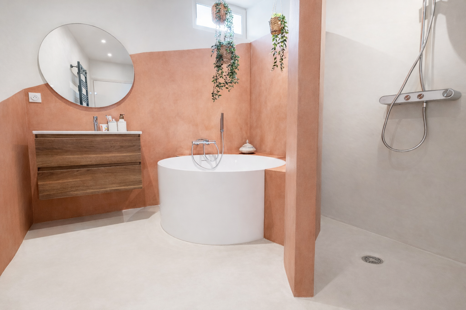 Cuisine ouverte équipée, espace dînatoire et séjour composent un ensemble harmonieux, baigné de lumière. Sur ce même étage se trouvent également une salle de bain en béton ciré aux teintes chaudes, réalisée sur mesure, comprenant une grande baignoire ronde et une douche, un WC séparé, un espace buanderie, ainsi que deux chambres reliées par un couloir donnant accès à une terrasse de 26 m².