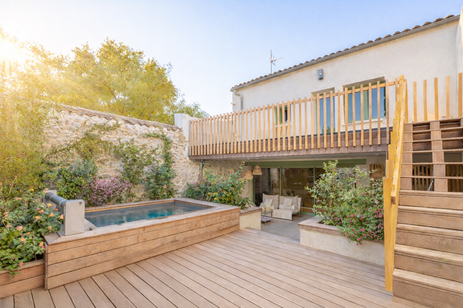 Le jardin paysagé de 70 m², mettant également en valeur les pierres d’origine, réunit plusieurs espaces de détente : grande terrasse carrelée, terrasse en bois exotique (Itauba) réalisée sur mesure, ainsi qu’une piscine chauffée et sécurisée par volet roulant. Les jardinières bénéficient d’un système d’arrosage automatique pour un entretien facilité.