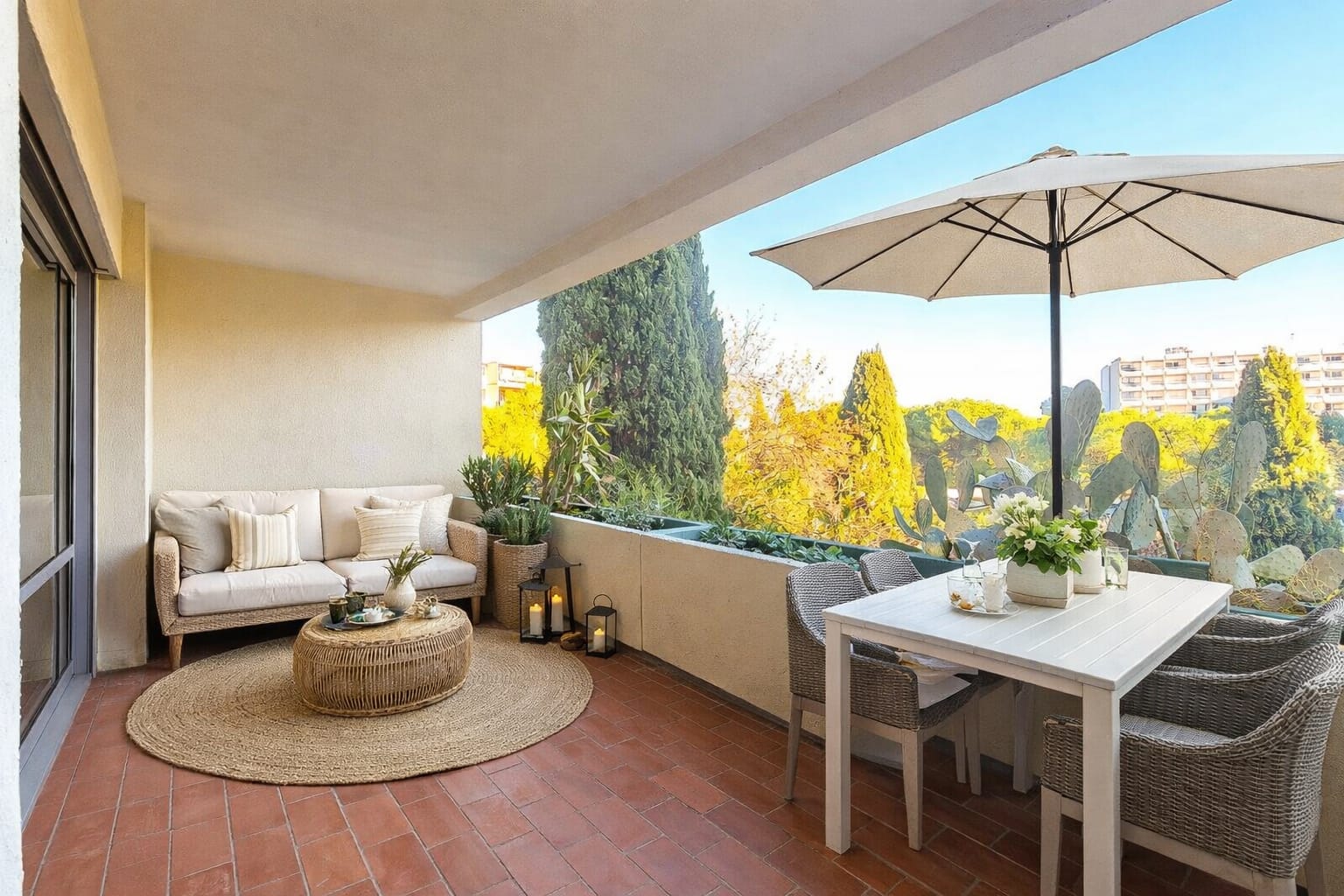 Il se compose d’un double séjour lumineux avec accès direct à une terrasse couverte de 11 m², idéale pour profiter de la verdure environnante en toute saison.