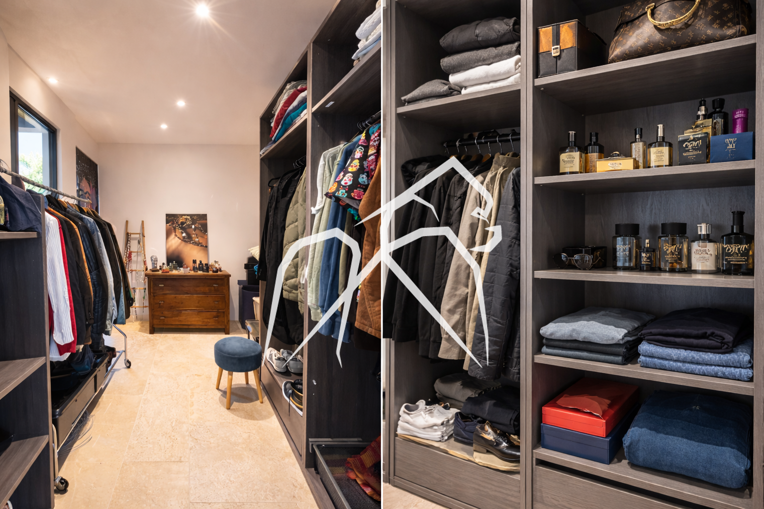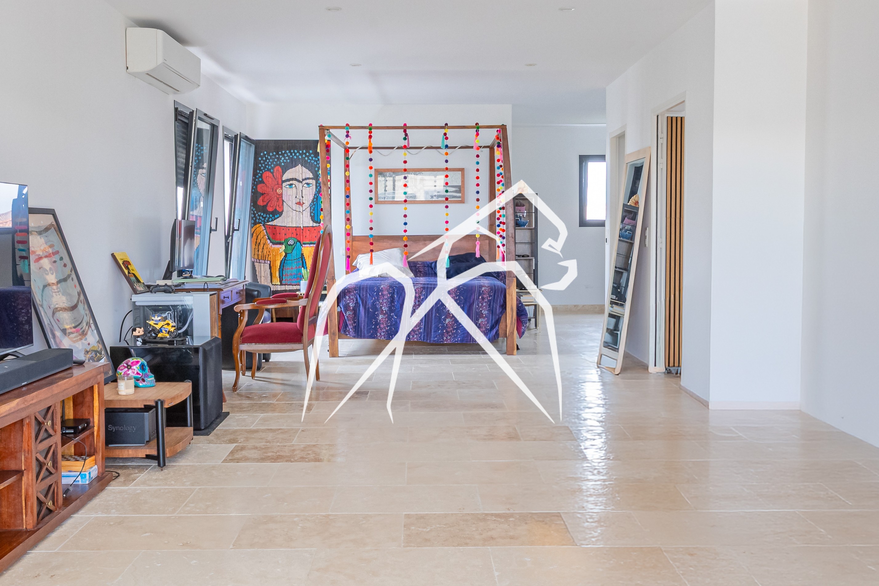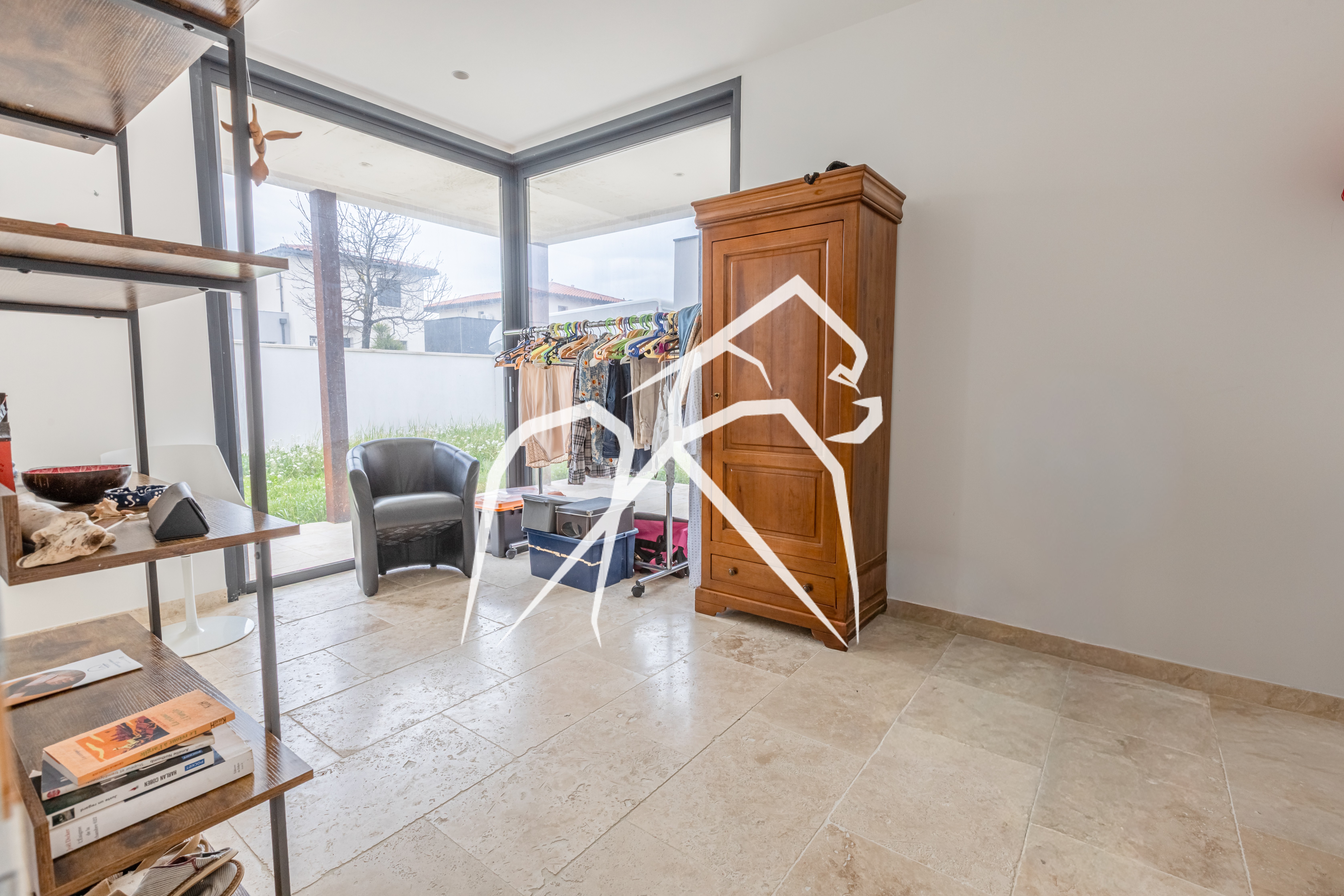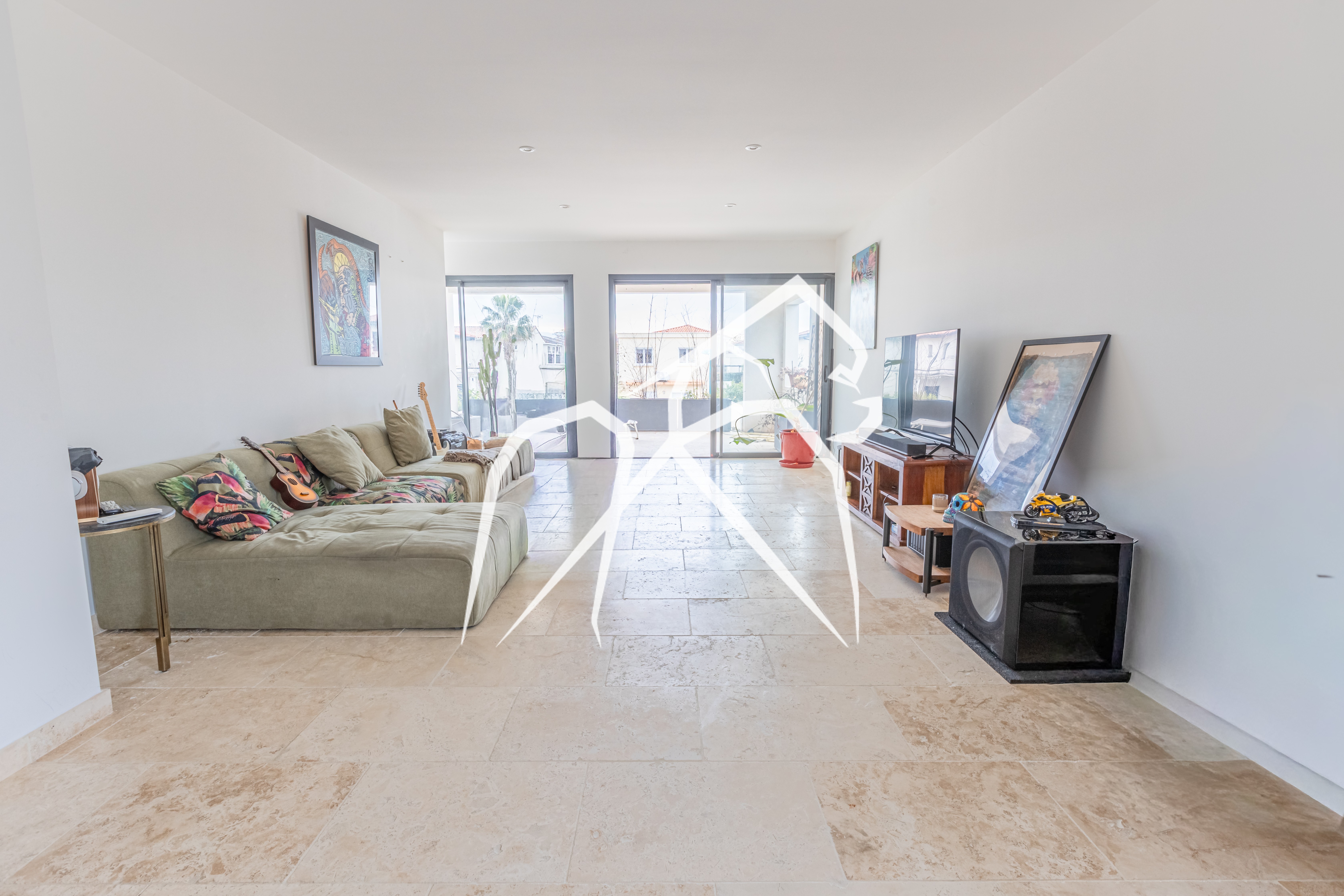 Le sol en travertin haut de gamme et les finitions soignées confirment immédiatement le standing du bien.